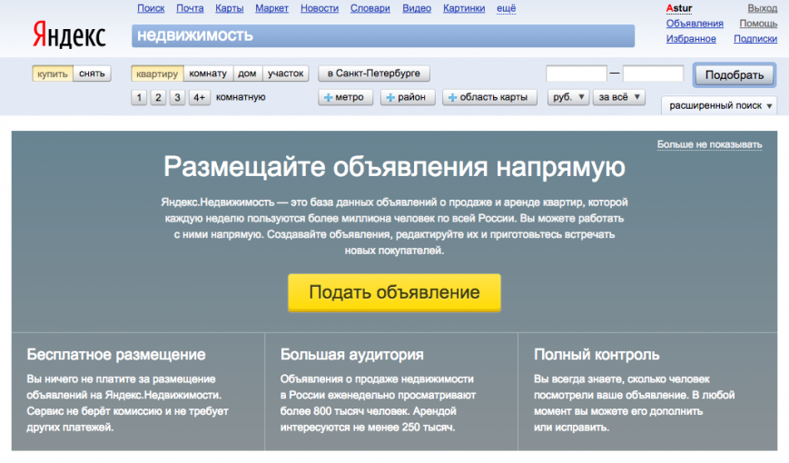 • Итак, первым и, наверное, одним из наиболее ожидаемых нововведений стала возможность размещения объявлений от пользователей. Еще недавно, сервис собирал информацию с сайтов-партнеров, таких как Allpn.ru и другие и не давал возможности размещения частных объявлений. Теперь же любой, кто зарегистрирован на Яндекс Почте имеет возможность разместить собственное объявление о покупке, продаже, желании сдать или снять в аренду недвижимость. В отличии от объявлений сайтов-партнеров, для пользователей разработчики предусмотрели самостоятельные карточки объектов, которые содержат описание, фотографии, место расположения на карте, цену и другу информацию. Помимо этого, на таких карточках также можно найти информацию о схожих объявлениях, которая добавляется автоматически. В будущем разработчики планируют выводить подобные карточки на все без исключения объявления, как от частных лиц, так и с сайтов-партнеров. В настоящее время такая модель работы находится на этапе тестирования и если оно пройдет успешно, то сервис «Яндекс. Недвижимость» больше не будет перенаправлять вас на сайты-партнеры, если вам потребуется более подробная информация об объекте, а предоставит все необходимое на своей странице.
